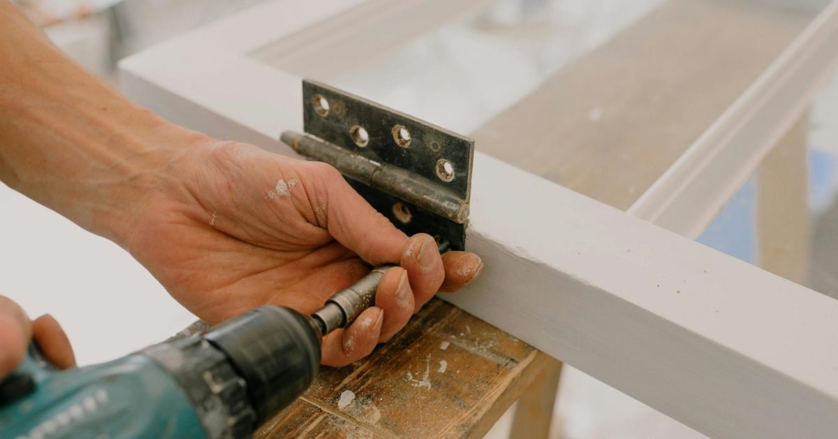 Crop unrecognizable worker drilling metal hinge on white window frame during house renovation
