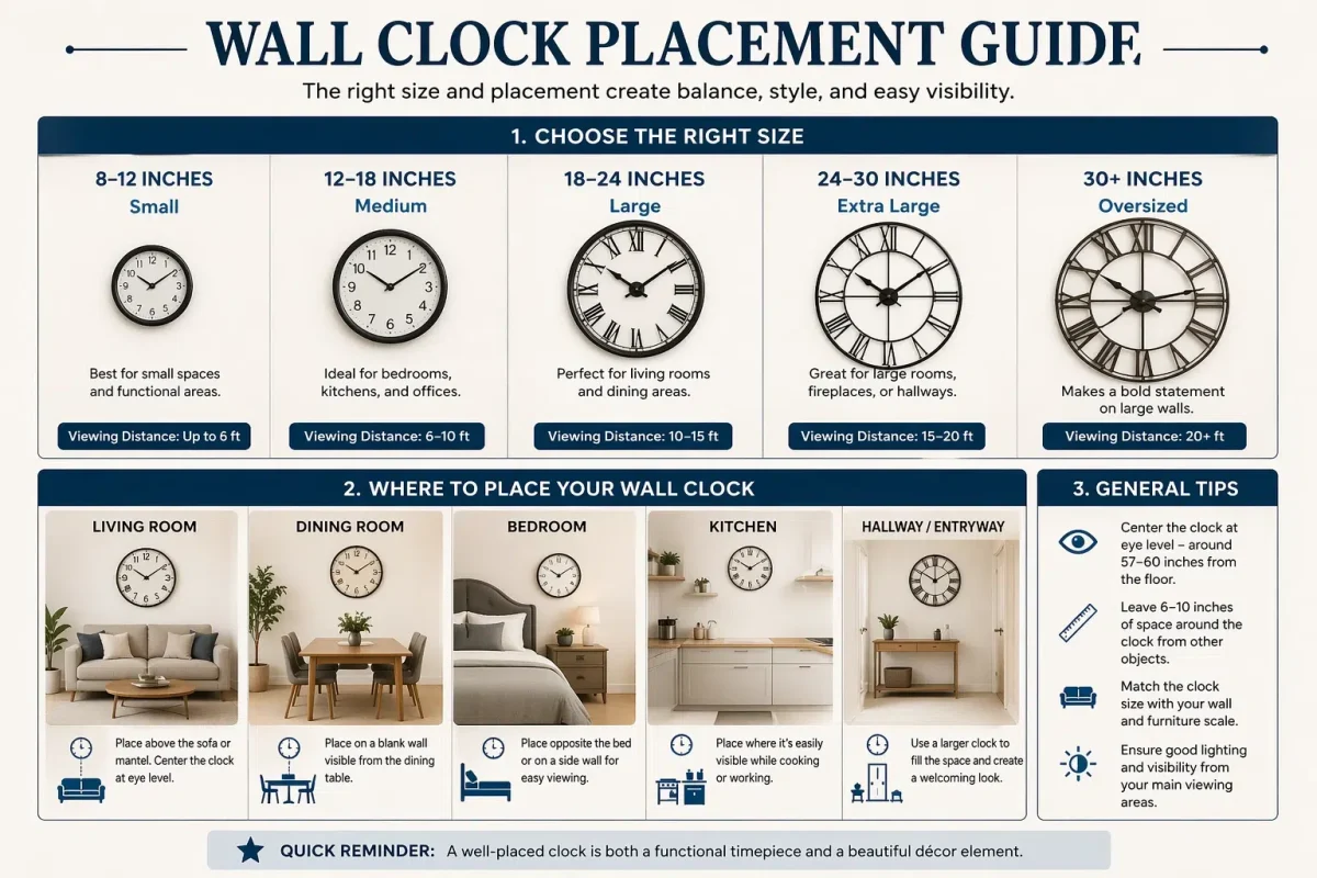 | Clock Diameter | Size Category | Ideal Room Type | Wall Space | Viewing Distance |